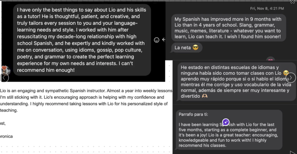 My Spanish has improved more in 9 months with Lio than in 4 years of school. Slang, grammar, music, memes, literature – whatever you want to learn, Lio can teach it. I wish I found him sooner